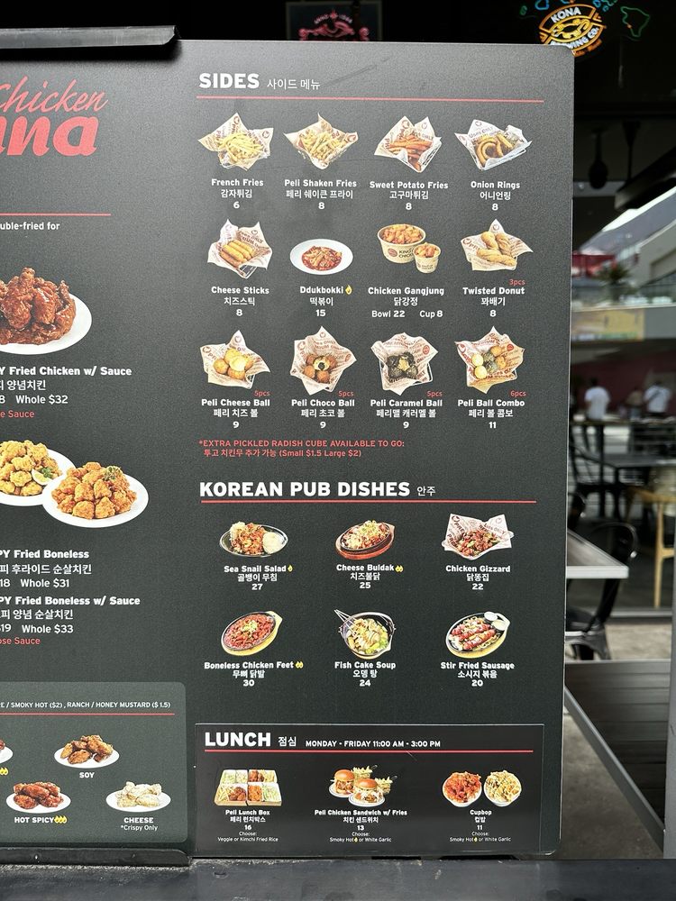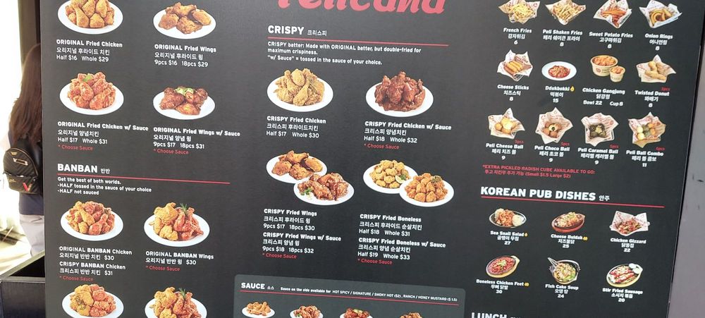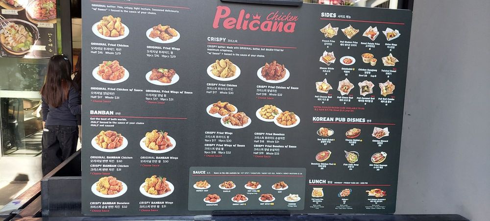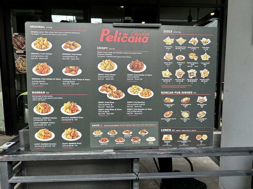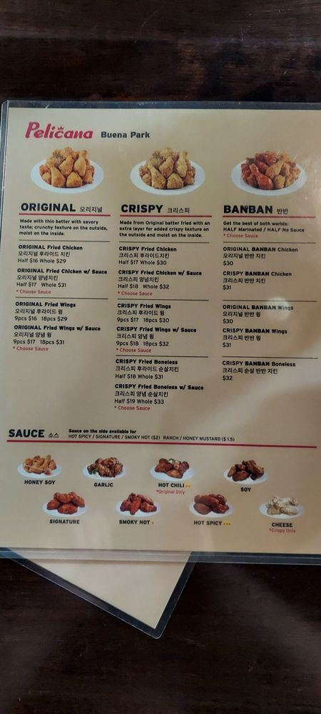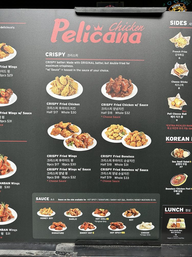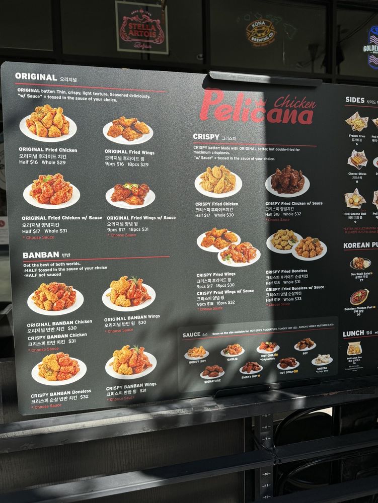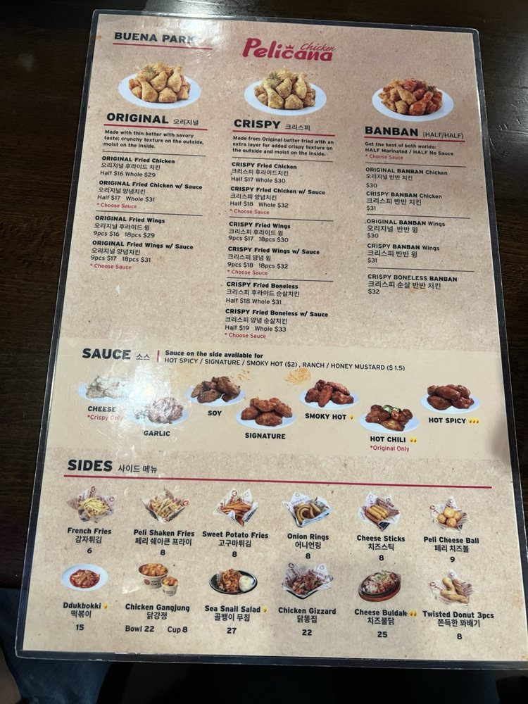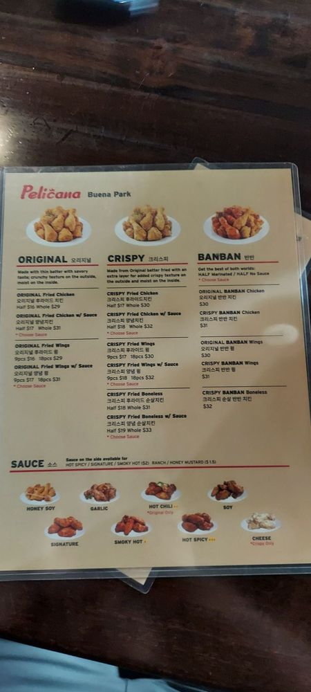 Pelican Chicken is a beer bar offering delicious Korean chicken wings in Buena Park, CA. The menu includes crispy wings with various sauce options, whole fried chicken, and unique sides like peli cheese balls and shaken fries. Customers rave about the juicy and flavorful chicken, with some noting the generous portion sizes. The service is top-notch, with attentive servers and a cozy atmosphere with TVs and music. The wait for freshly fried chicken is worth it, as the quality is consistently excellent. The spicy hot chili sauce and honey butter seasoning on the fries are standout items. Overall, Pelicana Chicken is a must-visit for Korean fried chicken enthusiasts seeking a casual, trendy dining experience with great food and service.